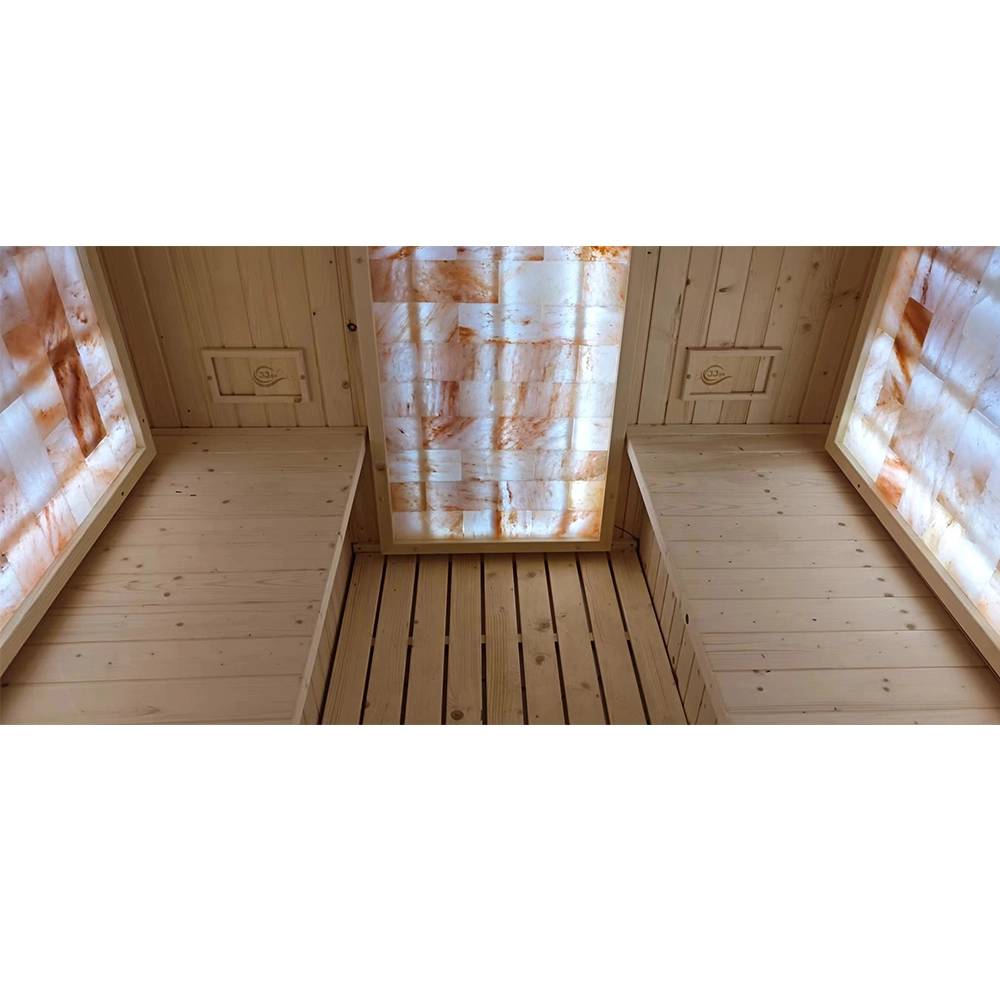 Posebnost ove saune su tri sofisticirano postavljene ploče s ciglama soli. Ove opeke ne samo da oplemenjuju prostor estetskom vrijednošću, već i poboljšavaju kvalitetu zraka uz blagotvoran učinak na dišni sustav.